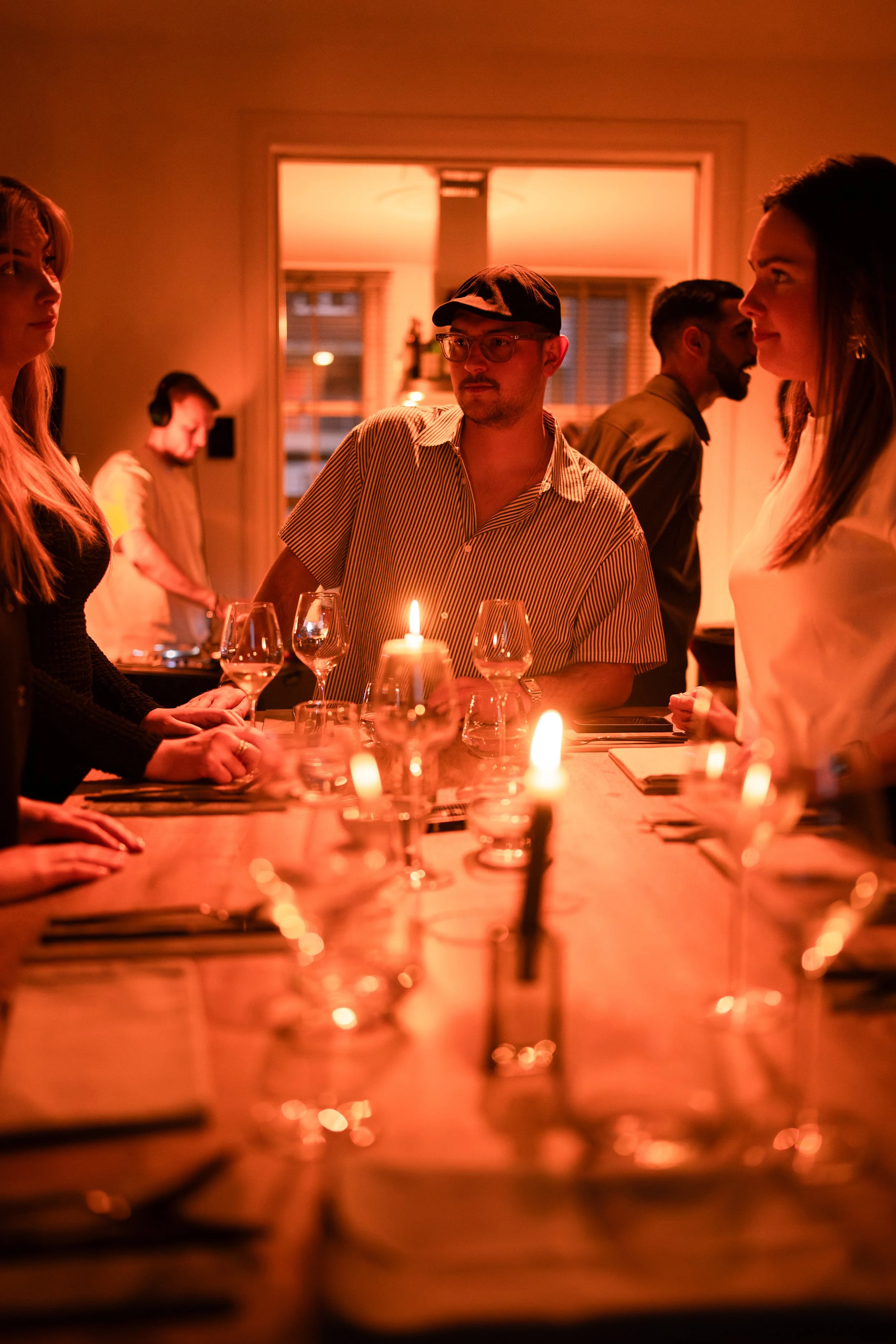 Staand dineren, uitgesproken gerechten, wijnen met karakter en een privé DJ in een huiselijke setting. Geen menu. Geen draaiboek.